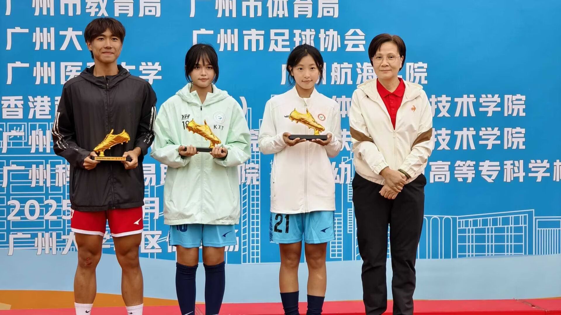 广州市足球协会党支部书记、秘书长刘杏薇为我校最佳射手邝晓桃颁奖(左二为邝晓桃同学)