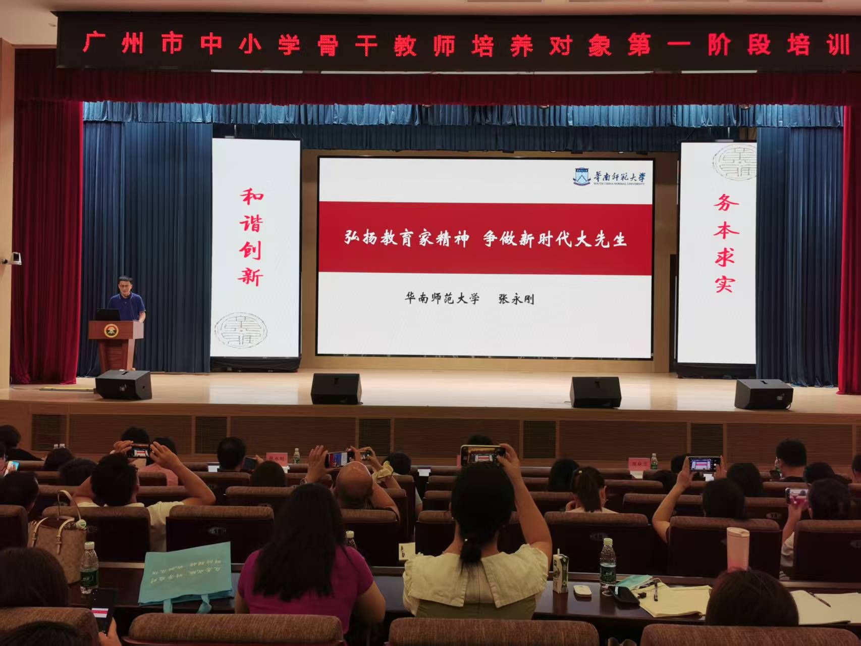 5 月 29 日,本次培训第一阶段集中研修在广东广雅中学(荔湾校区)莲韬馆报告厅顺利启动。开班仪式后,《弘扬教育家精神 争做新时代大先生》专题讲座拉开培训序幕,华南师范大学张永刚教授以深厚的教育情怀与生动案例,引导骨干教师重温教育初心,坚定“为党育人、为国育才”的使命担当。当天,来自广州 11 个区的 近600名骨干教师培养对象齐聚一堂,认真聆听、积极互动。大家纷纷表示,首场培训既明确了方向,又激发了动力,为后续学习奠定了坚实的思想基础。